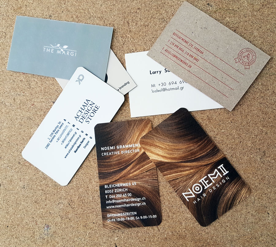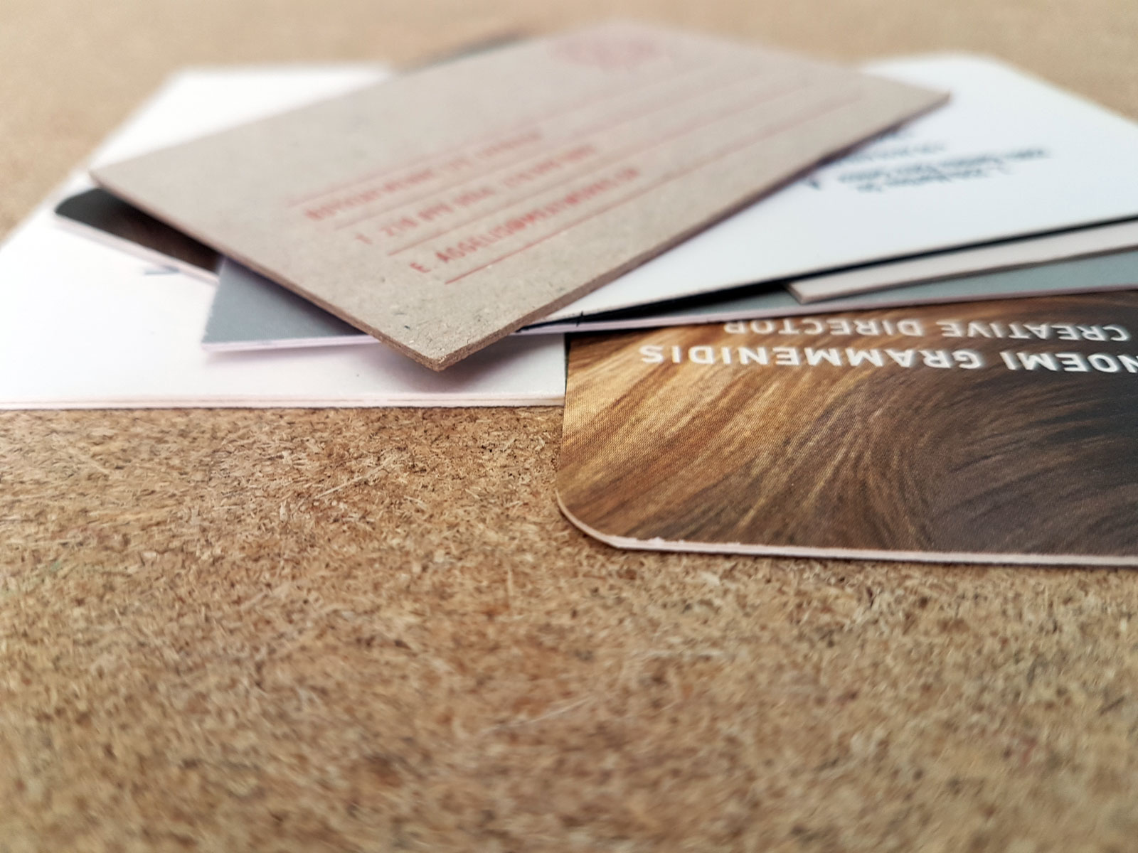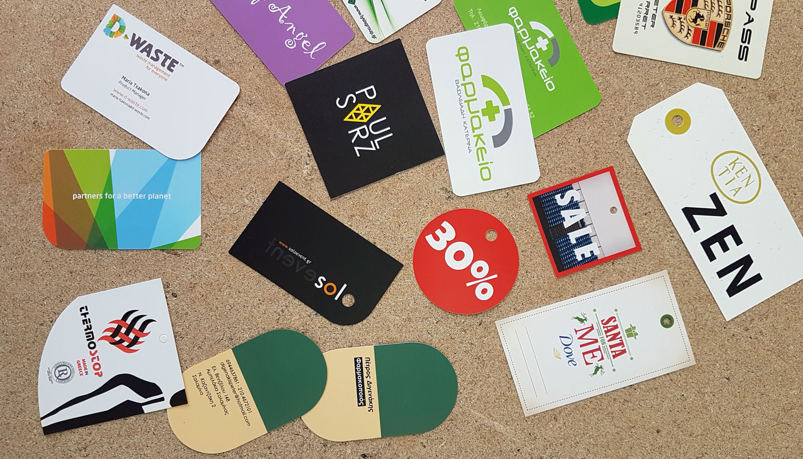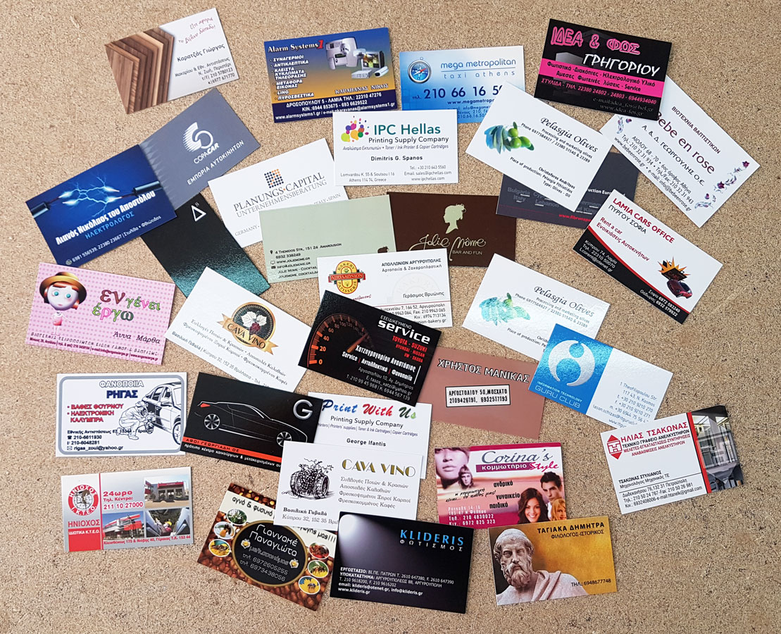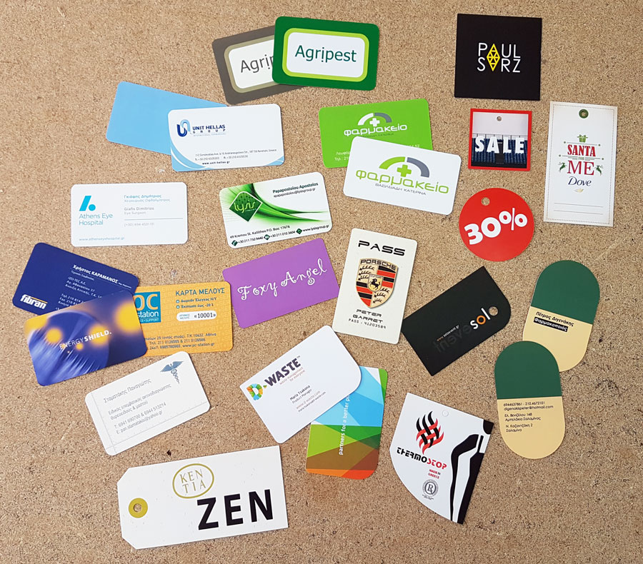 ΑCommon cardboard type, gloss or matte film laminated, special & luxury paper cards, luxury & special effects cards, eco paper cards, extra volume cardboard double or triple laminated cards, plastic cards, etc.