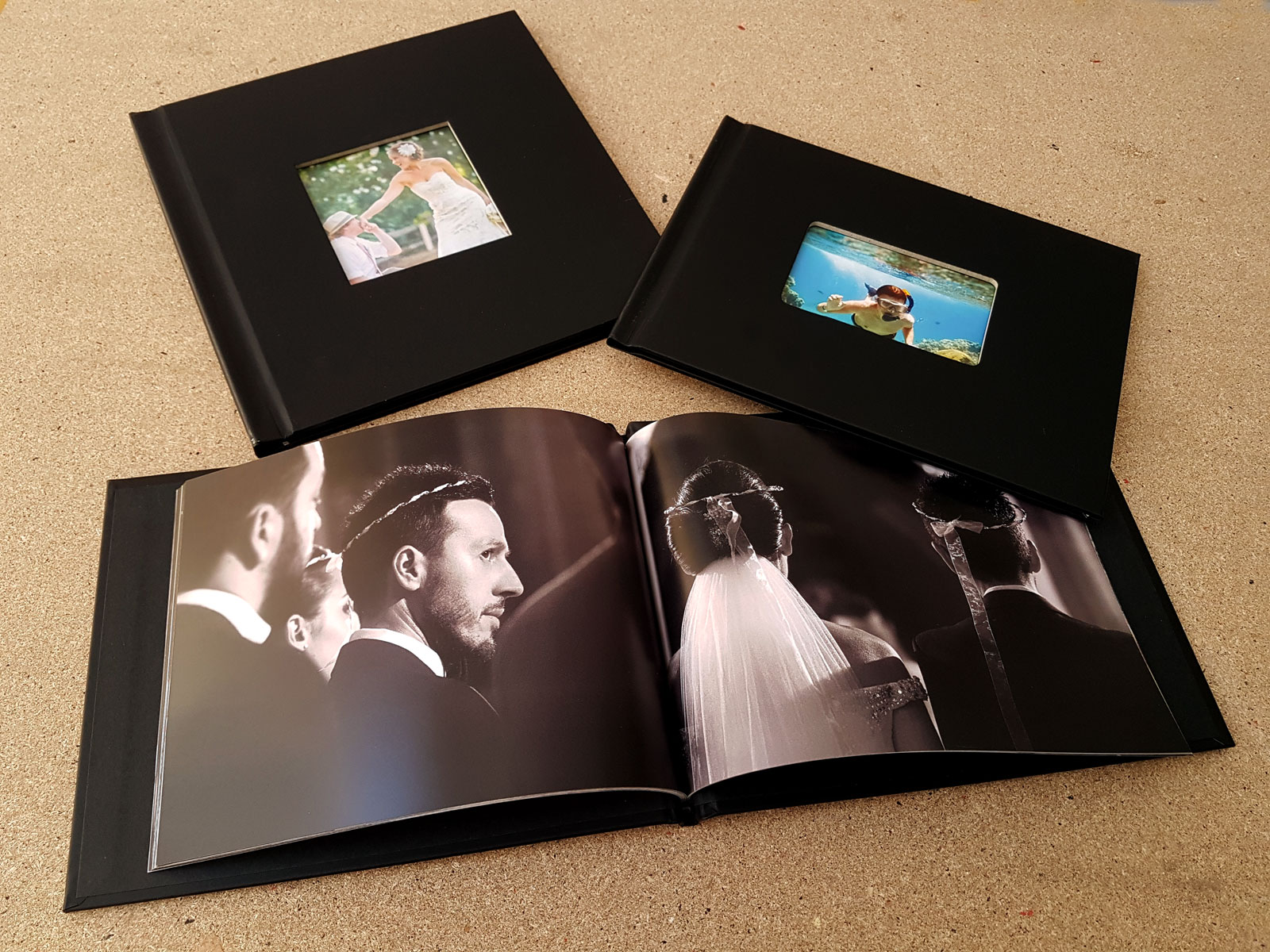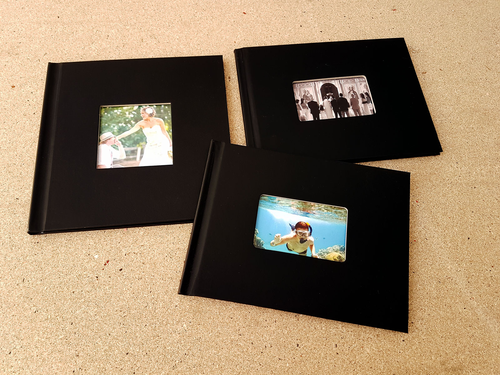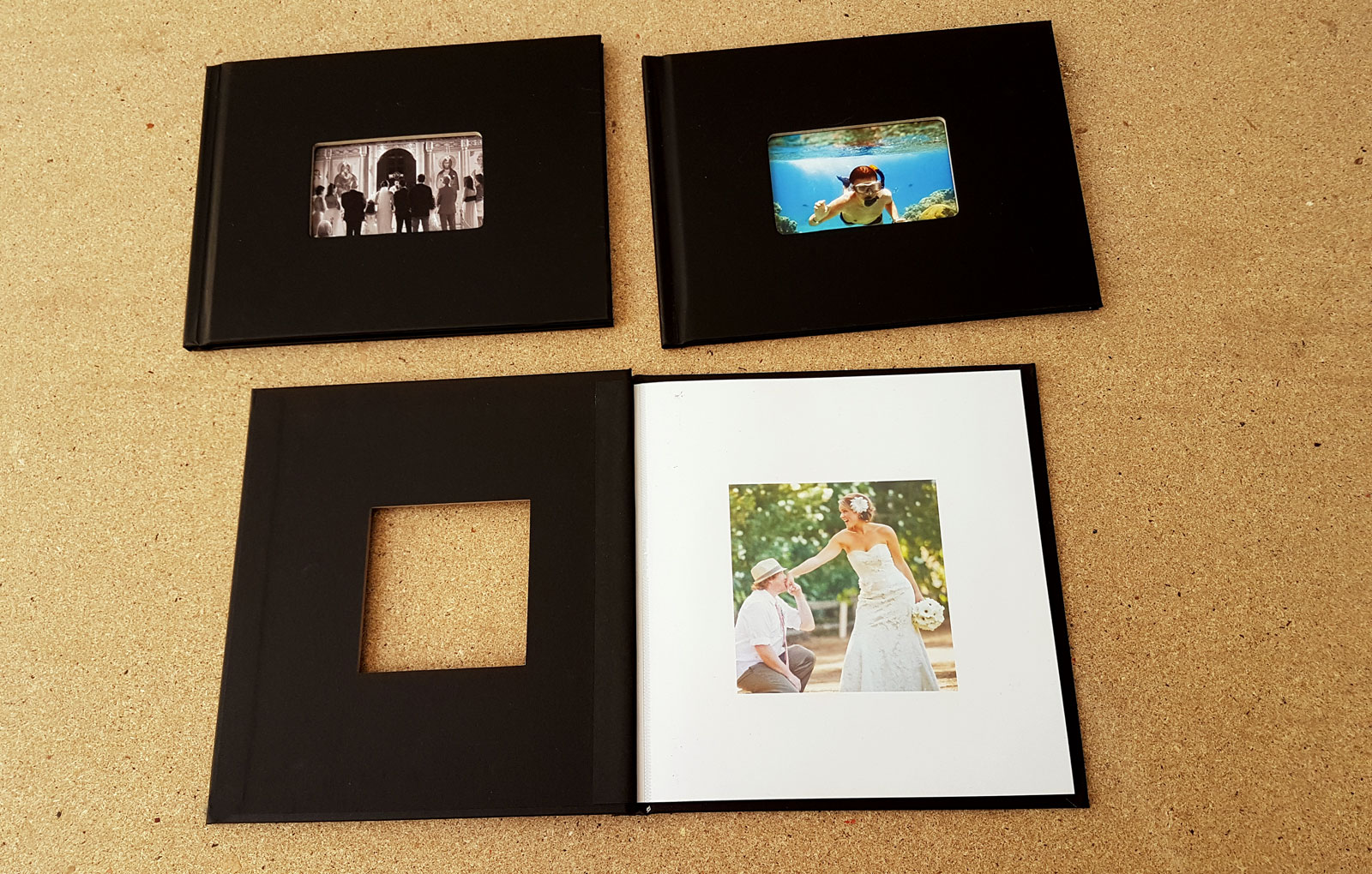 Βιβλία φωτογραφιών με μονόχρωμο σκληρό εξώφυλλο με τρύπα «παράθυρο», απ’ όπου φαίνεται η φωτογραφία της πρώτης εσωτερικής σελίδας. Οι εσωτερικές σελίδες τυπώνονται σε μαλακό ημιγυαλιστερό χαρτί illustration 170gr. Αριθμός Εσωτερικών σελίδων: 24 έως 64 σελίδες