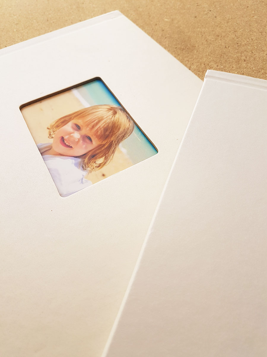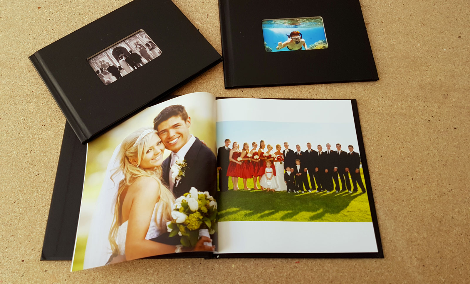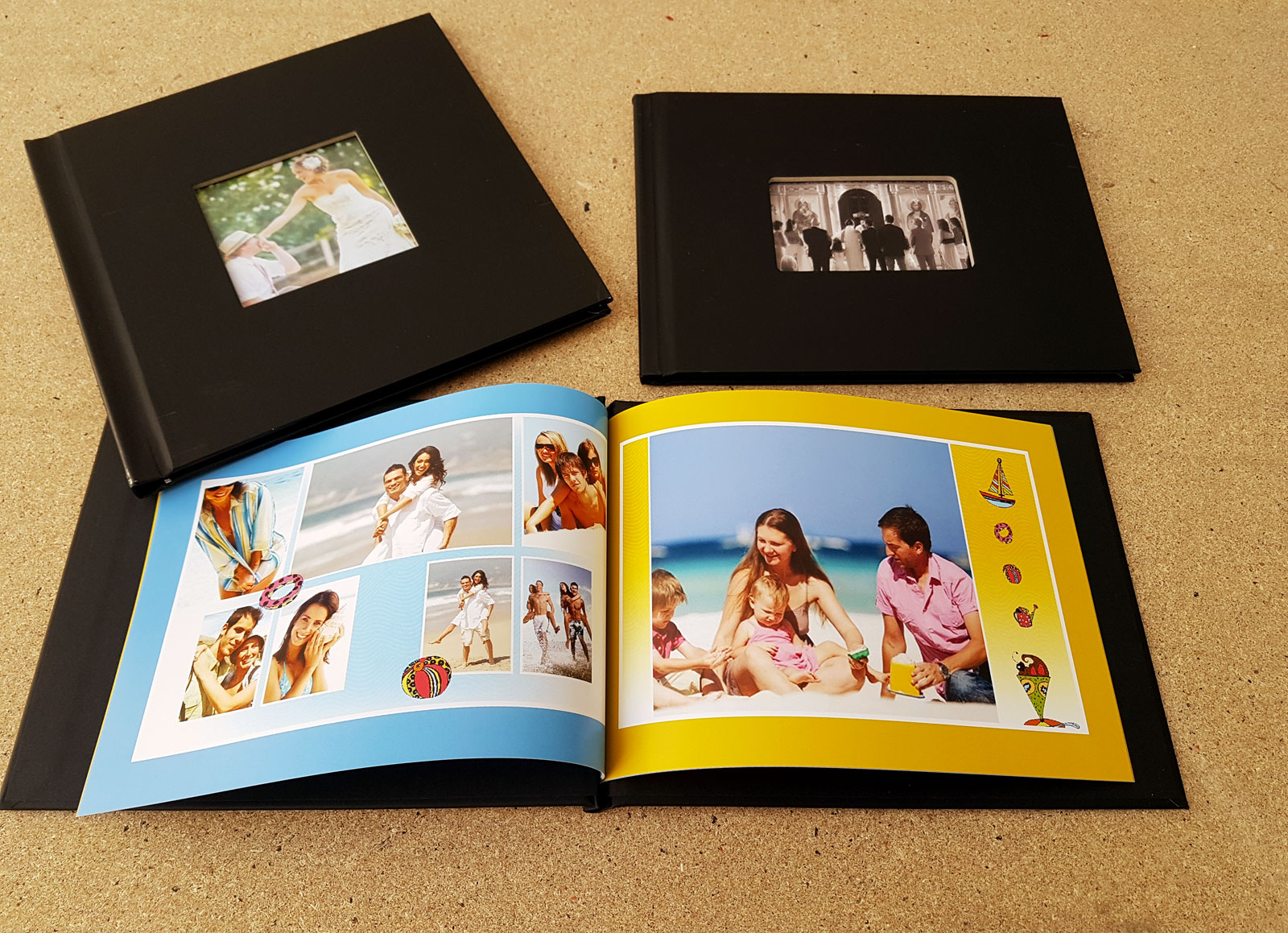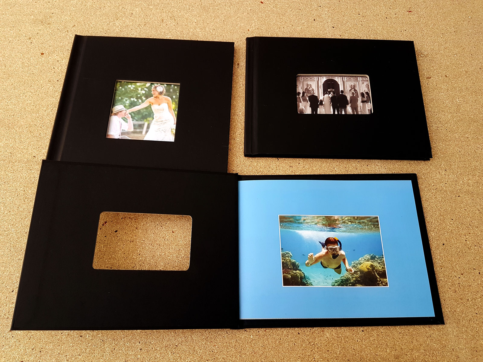 Βιβλία φωτογραφιών με μονόχρωμο σκληρό εξώφυλλο με τρύπα «παράθυρο», απ’ όπου φαίνεται η φωτογραφία της πρώτης εσωτερικής σελίδας. Οι εσωτερικές σελίδες τυπώνονται σε μαλακό ημιγυαλιστερό χαρτί illustration 170gr. Αριθμός Εσωτερικών σελίδων: 24 έως 64 σελίδες
